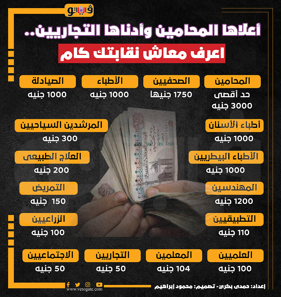أعلاها المحامين وأدناها التجاريين.. اعرف معاش نقابتك كام | انفوجراف الخميس 30/يونيو/2022 - 02:30 م 6/30/2022 2:30:45 PM نقابة المحامين حمدي بكري شارك طباعة 18 حجم الخط شارك طباعة النقابات المهنية المعاشات المعاشات الشهرية قيمة المعاشات الشهرية معاشات النقابات