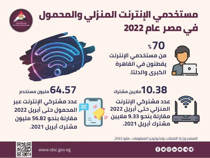 نشر مركز المعلومات ودعم اتخاذ القرار بمجلس الوزراء، إنفوجراف جديد عبر صفحته الرسمية على موقع التواصل الاجتماعي فيسبوك، تحت عنوان " مستخدمي الإنترنت المنزلي والمحمول في مصر عام 2022".