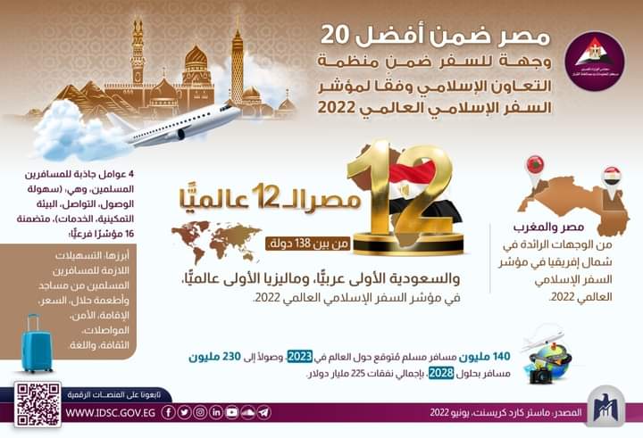 وحدّد مؤشر السفر الإسلامي العالمي مجموعة من العوامل الجاذبة للمسافرين لمسلمين حول العالم، لتأتي مصر بالمرتبة الـ 12 عالميًّا في مؤشر السفر الإسلامي العالمي لعام 2022 من بين 138 دولة، لتصُنف أيضًا مع المغرب ضمن الوجهات الرائدة للسفر الإسلامي في شمال إفريقيا.
