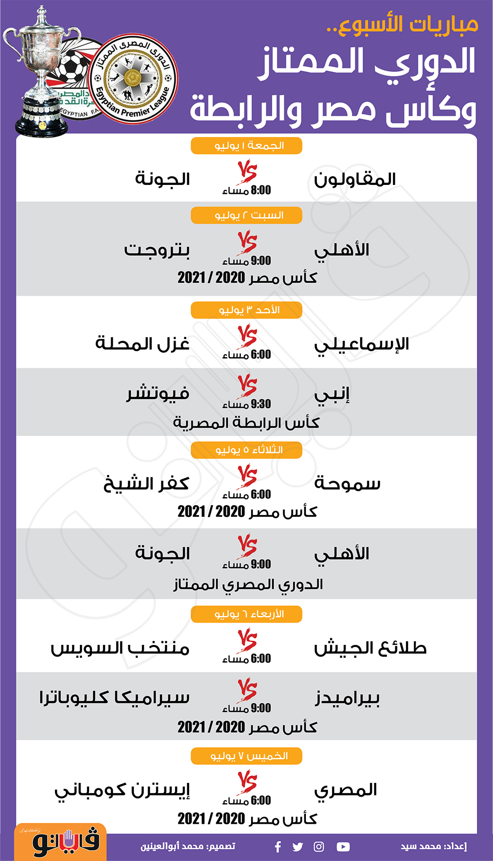 مباريات الأسبوع.. الدوري الممتاز وكأس مصر والرابطة | إنفوجراف الجمعة 01/يوليو/2022 - 02:51 م 7/1/2022 2:51:55 PM كأس مصر محمد سيد شارك طباعة 18 حجم الخط شارك طباعة الأهلي الدوري الممتاز بيراميدز كأس مصر سموحة الجونة طلائع الجيش سيراميكا كليوباترا غزل المحلة