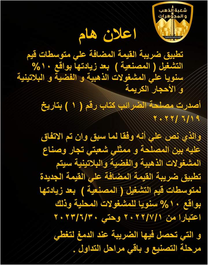 وأصدرت مصلحة الضرائب كتابا دوريا رقم ١ بتاريخ 19 يونيو 2022 نص على أنه وفقا لما تم الاتفاق عليه بين المصلحة وممثلي شباب تجار وصناع المشغولات الذهبية والفضية والبلاتينية سيتم تطبيق ضريبة القيمة المضافة على القيمة الجديدة المتوسطات قيم التشغيل (المصنعية) بعد زيادتها بواقع ١٠ % سنويا المشغولات المحلية وذلك اعتبار من ١ يوليو والتي تحصل فيها الضريبة عند الدعم لتغطي مرحلة للتصنيع وباقي مراحل التداول.