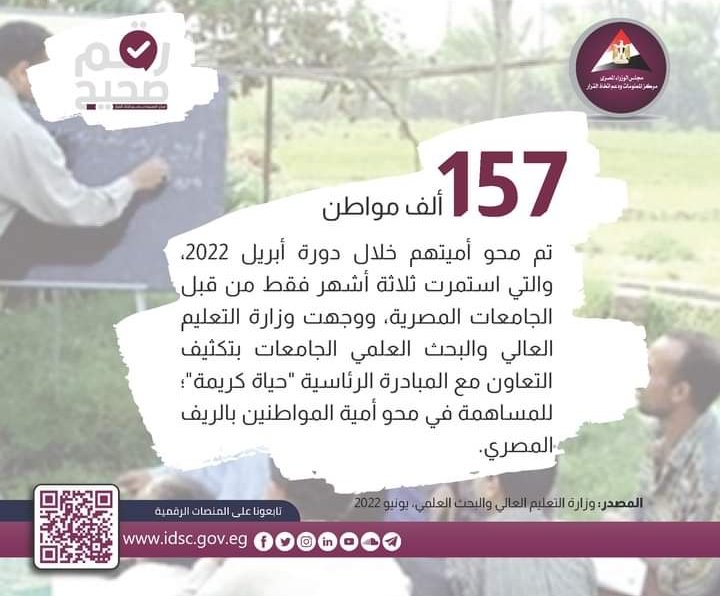 نشر مركز المعلومات ودعم اتخاذ القرار بمجلس الوزراء إنفوجراف جديد عبر صفحته الرسمية على موقع التواصل الاجتماعي فيسبوك، أكد خلاله أنه خلال 3 أشهر فقط نجحت الجامعات المصرية في محو أمية 157 ألف مواطن.