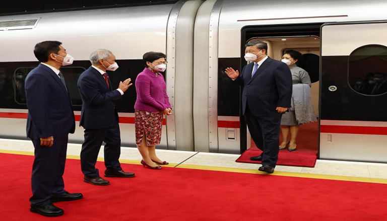 وكان في استقبال شي وقرينته بنج لي يوان، الرئيسة التنفيذية لمنطقة هونج كونج الإدارية الخاصة كاري لام وزوجها لام سيو-بور، في محطة كولون الغربية للسكك الحديد فائقة السرعة.