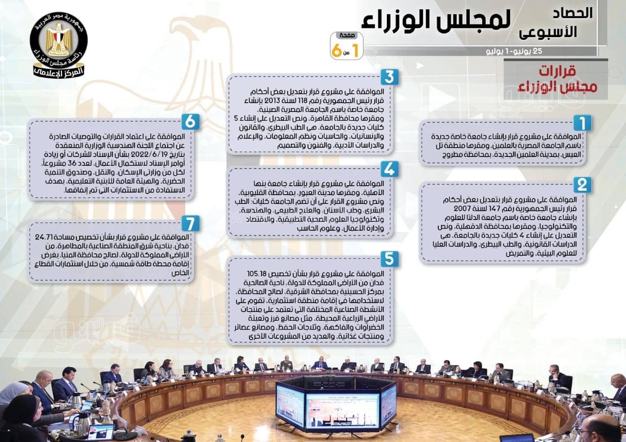 إنشاء جامعات جديدة الأبرز.. حصاد قرارات مجلس الوزراء خلال أسبوع | إنفوجراف