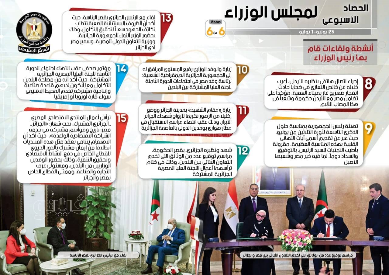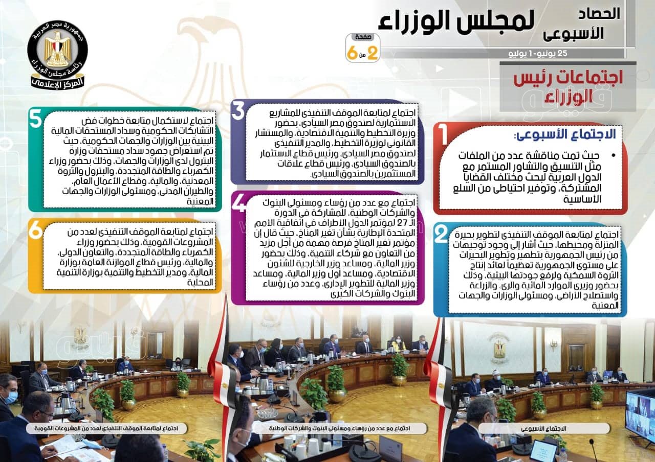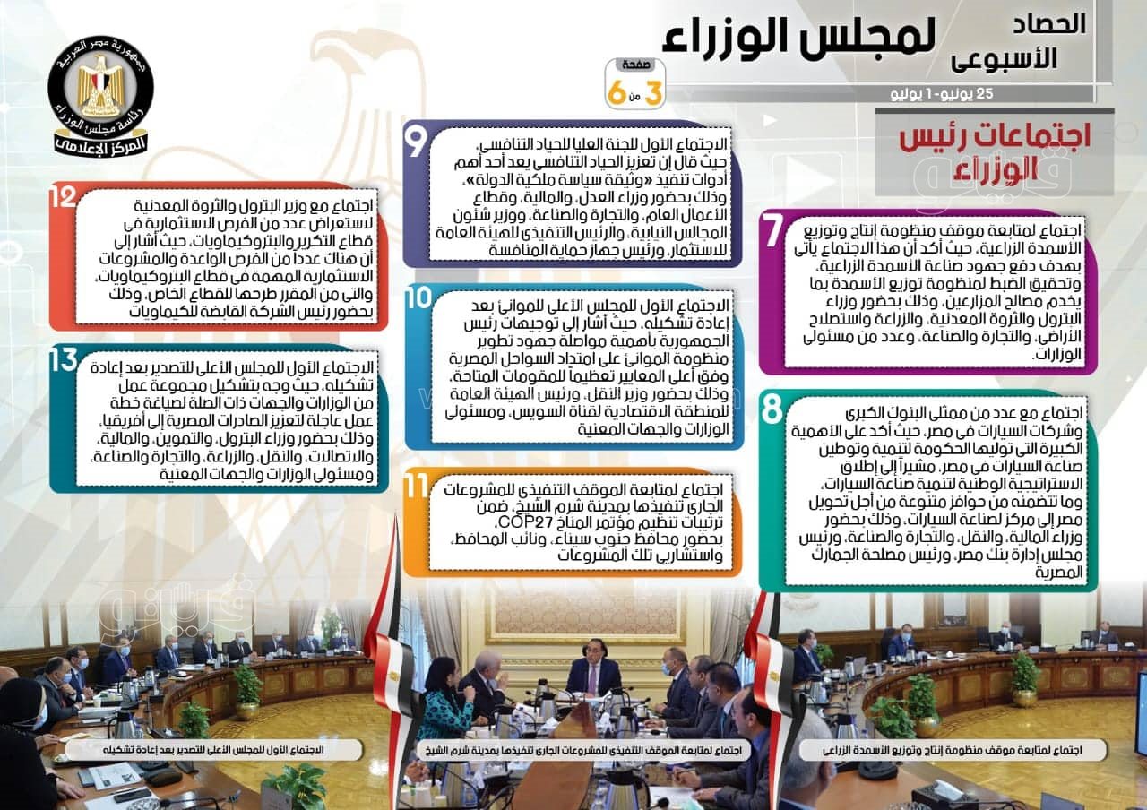 نشر المركز الإعلامي لمجلس الوزراء، تقريرًا شمل إنفوجرافات سلط من خلالها الضوء على الحصاد الأسبوعي لمجلس الوزراء، وذلك خلال الفترة من25 يونيو حتى 1 يوليو 2022، والذي تضمن الموافقة على عدد من القرارات، فضلًا عن الاجتماعات واللقاءات التي عقدها الدكتور مصطفى مدبولي، رئيس مجلس الوزراء، بالإضافة إلى ما قام به مدبولي من أنشطة.