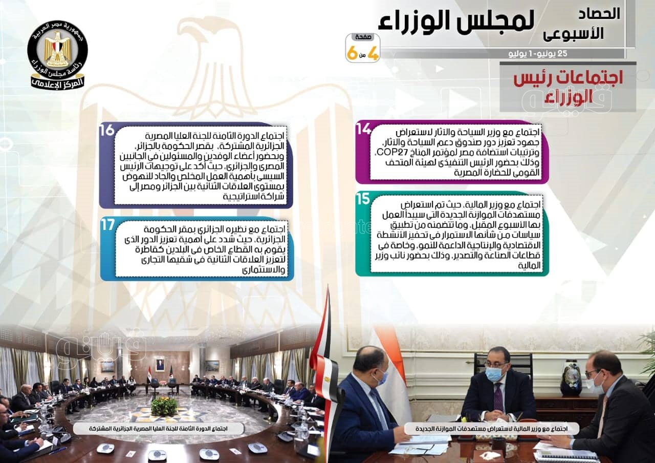 واستكمالًا للاجتماعات التي عقدها رئيس الوزراء، أظهر التقرير، الاجتماع الأول للمجلس الأعلى للتصدير بعد إعادة تشكيله، حيث وجه بتشكيل مجموعة عمل من الوزارات والجهات ذات الصلة لصياغة خطة عمل عاجلة لتعزيز الصادرات المصرية إلى أفريقيا، وذلك بحضور وزراء البترول، والتموين، والمالية، والاتصالات، والنقل، والزراعة، والتجارة والصناعة، ورئيس الهيئة العامة للمنطقة الاقتصادية لقناة السويس، والرئيس التنفيذي للهيئة العامة للاستثمار، ورئيس مجلس إدارة اتحاد الصناعات المصرية، وعبر تقنية الفيديو كونفرانس، وزير قطاع الأعمال العام، والمدير التنفيذي لصندوق مصر السيادي، ومسئولي الوزارات والجهات المعنية، إلى جانب اجتماع مع وزير السياحة والآثار لاستعراض جهود تعزيز دور صندوق دعم السياحة والآثار، وترتيبات استضافة مصر لمؤتمر المناخ COP27، وذلك بحضور الرئيس التنفيذي لهيئة المتحف القومي للحضارة المصرية، وكذلك اجتماع مع وزير المالية، حيث تم استعراض مستهدفات الموازنة الجديدة التي سيبدأ العمل بها الأسبوع المقبل، وما تتضمنه من تطبيق سياسات مـن شأنها الاستمرار في تحفيز الأنشطة الاقتصادية والإنتاجية الداعمة للنمو، وخاصة في قطاعات الصناعة والتصدير، وذلك بحضور نائب وزير المالية، فضلًا عن اجتماع الدورة الثامنة للجنة العليا المصرية الجزائرية المشتركة، بقصر الحكومة بالجزائر، وبحضور أعضاء الوفدين والمسئولين في الجانبين المصرى والجزائرى، حيث أكد على توجيهات الرئيس السيسي بأهمية العمل المخلص والجاد للنهوض بمستوى العلاقات الثنائية بين الجزائر ومصر إلى شراكة استراتيجية، بجانب اجتماع مع نظيره الجزائري بمقر الحكومة الجزائرية، حيث شدد على أهمية تعزيز الدور الذي يقوم به القطاع الخاص في البلدين كقاطرة لتعزيز العلاقات الثنائية في شقيها التجاري والاستثماري