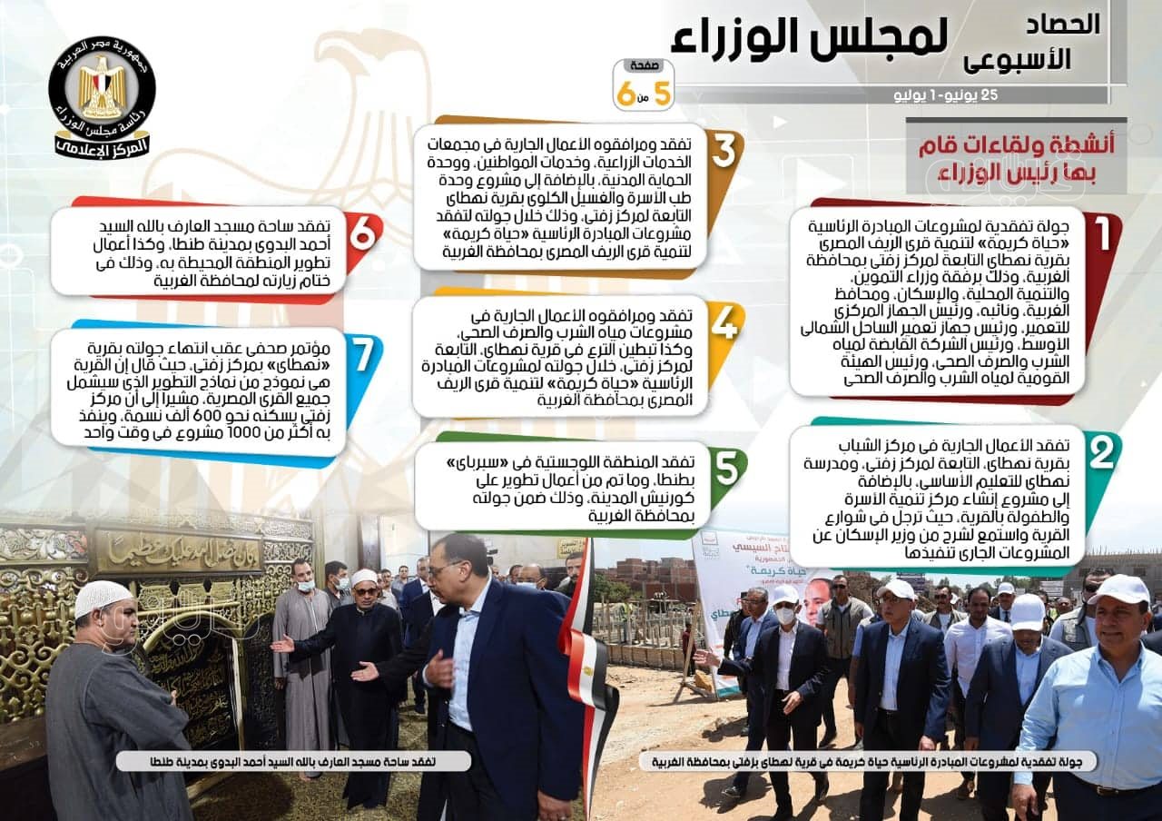وفي السياق ذاته، تضمنت الأنشطة أيضًا وفقًا لما أبرزه التقرير، تفقد مدبولي ومرافقوه الأعمال الجارية في مشروعات مياه الشرب والصرف الصحي، وكذا تبطين الترع في قرية نهطاي، التابعة لمركز زفتى، خلال جولته لمشروعات المبادرة الرئاسية "حياة كريمة" لتنمية قرى الريف المصري بمحافظة الغربية، بالإضافة إلى تفقد المنطقة اللوجستية في "سبرباى" بطنطا، وما تم من أعمال تطوير على كورنيش المدينة، وذلك ضمن جولته بمحافظة الغربية، فضلًا عن تفقد ساحة مسجد العارف بالله أحمد البدوي بمدينة طنطا، وكذا أعمال تطوير المنطقة المحيطة به، وذلك في ختام زيارته لمحافظة الغربية، كما عقد مدبولي مؤتمرًا صحفيًا عقب انتهاء جولته بقرية "نهطاي" بمركز زفتى، حيث قال إن القرية هي نموذج من نماذج التطوير الذي سيشمل جميع القرى المصرية، مشيرًا إلى أن مركز زفتى يسكنه نحو 600 ألف نسمة، وينفذ به أكثر من 1000 مشروع في وقت واحد، إلى جانب إجراء اتصال هاتفي بنظيره الأردني، أعرب خلاله عن خالص التعازي في ضحايا حادث انفجار صهريج غاز بميناء العقبة، مؤكدًا على تضامن مصر مع الأردن حكومة وشعبًا في هذا المصاب الأليم، كما هنئ مدبولي رئيس الجمهورية بمناسبة حلول الذكرى التاسعة لثورة الثلاثين من يونيو، حيث عبر عن تقديم أسمى آيات التهاني القلبية بهذه المناسبة العظيمة، مقرونة بأطيب التمنيات للسيد الرئيس، بالتوفيق والسداد دومًا، لما فيه خير مصر وشعبها الأصيل.