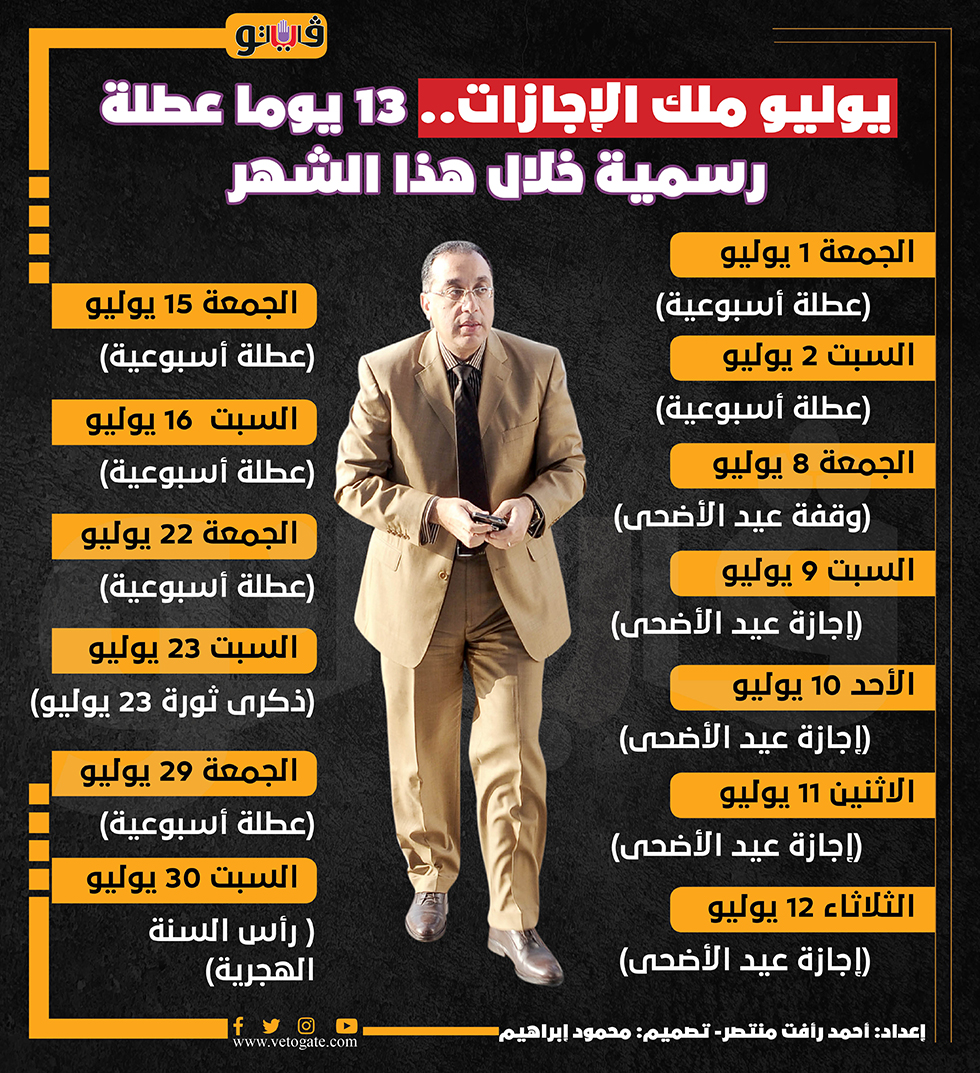 يوليو ملك الإجازات.. 13 يوما عطلة رسمية خلال هذا الشهر | إنفوجراف السبت 02/يوليو/2022 - 11:11 ص 7/2/2022 11:11:12 AM المواطنين أحمد رأفت منتصر شارك طباعة 18 حجم الخط شارك طباعة اجازة عيد الاضحي وقفة عيد الاضحي اجازة راس السنة الهجرية اجازة 23 يوليو اجازات شهر يوليو 2022 اجازات ٢٠٢٢ اجازات 2022