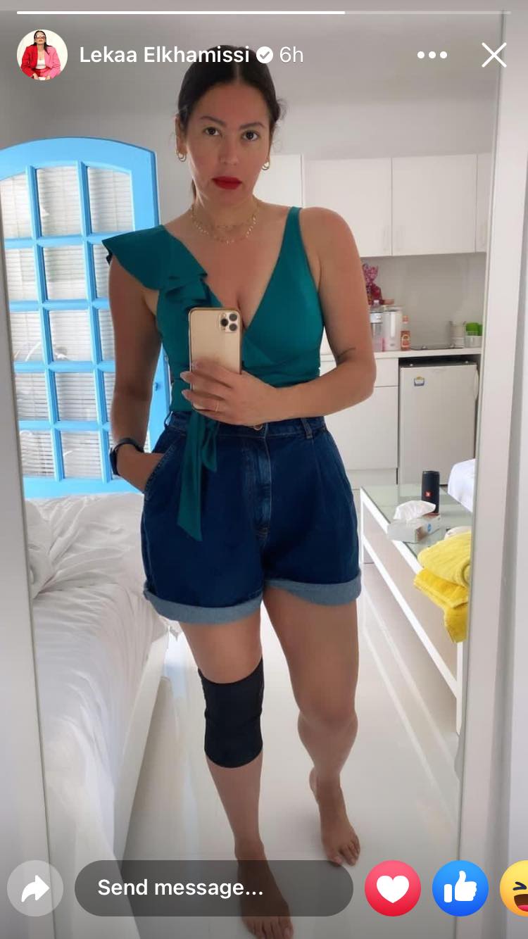 مؤخرا فوجئ الجمهور بإصابة الفنانة لقاء الخميسي بالركبة حيث شاركت الجمهور صورة من خلال خاصية "ستوري" ظهرت فيها برباط ضاغط علي "ركبتها".