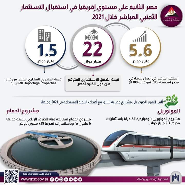 كما نشر مركز المعلومات ودعم اتخاذ القرار بمجلس الوزراء، إنفوجراف آخر عبر صفحته الرسمية على موقع التواصل الاجتماعي فيسبوك، تحت عنوان "مصر ضمن أفضل 20 وجهة للسفر في 2022".