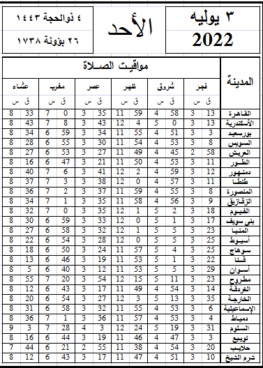 مواقيت الصلاة اليوم وفقًا للتوقيت المحلي لمدينتي القاهرة والإسكندرية وعدد من مدن ومحافظات الجمهورية: