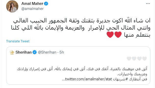 وكتبت آمال ماهر تغريدة ردًا على رسالة الفنانة شريهان فقالت: "ان شاء الله أكون جديرة بثقتك وثقة الجمهور الحبيب الغالي وانتي المثال الحي للإصرار والعزيمة والإيمان بالله اللي كلنا بنتعلم منها"