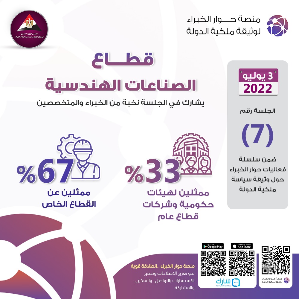 يعقد مركز المعلومات ودعم اتخاذ القرار بمجلس الوزراء، ورشة عمل، غدًا الأحد، لمناقشة وثيقة سياسة ملكية الدولة بقطاع الصناعات الهندسية، في سابع الجولات النقاشية لـ "حوار الخبراء" بين الحكومة والقطاع الخاص والمختصين ومختلف أطراف المنظومة الاقتصادية.