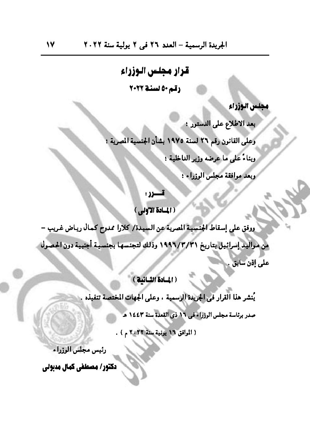 -قرار رئيس الوزراء رقم 50 لسنة 2022، بالموافقة على إسقاط الجنسية المصرية عن كلارا ممدوح كمال رياض غريب، من مواليد إسرائيل 31/3/1996.