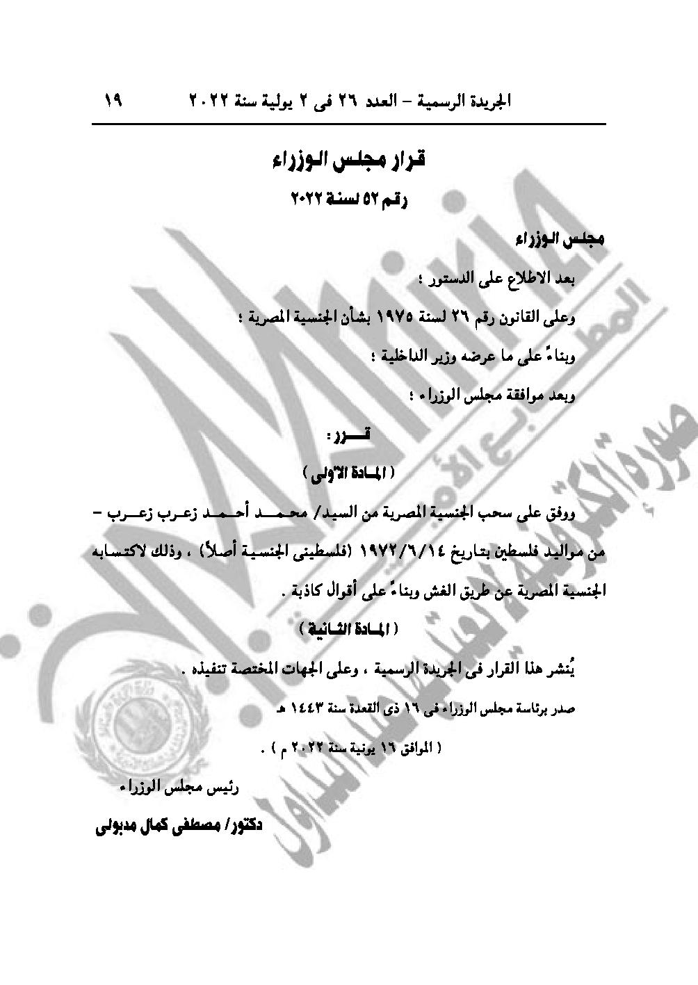 -قرار رئيس الوزراء رقم 52 لسنة 2022، بالموافقة على سحب الجنسية المصرية عن محمد أحمد زعرب زعرب، من مواليد فلسطين بتاريخ 14/6/1972.