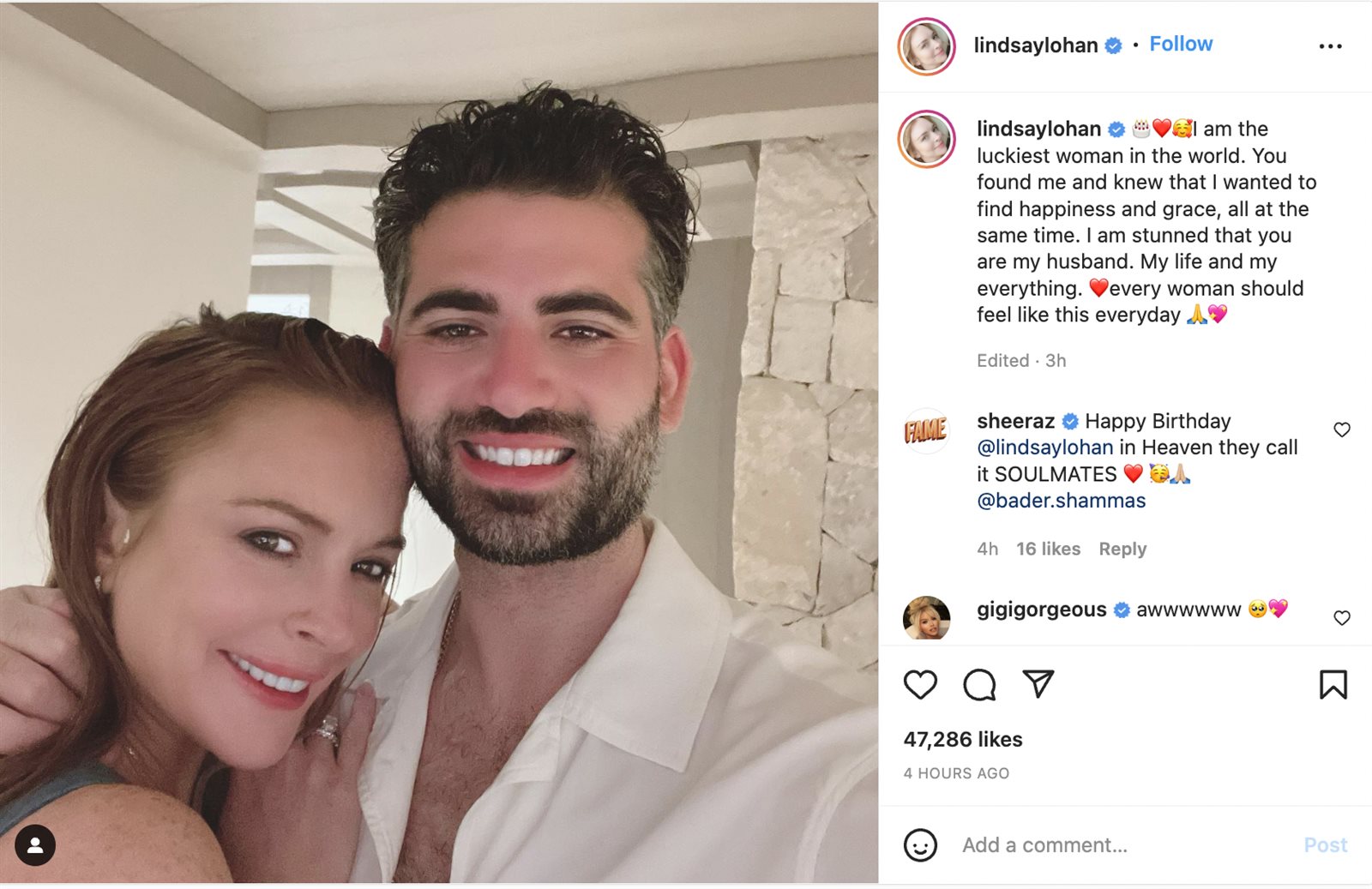 أعلنت الممثلة الأمريكية ليندسي لوهان عن زواجها من رجل الأعمال العربي بدر شماس منذ ساعات عبر حسابها الرسمي علي موقع الصور والفيديوهات “انستجرام”، وذلك بعد أن نشرت صورة جديدة مع رجل الأعمال العربي بدر شماس وعلقا عليها واصفة اياه بزوجها وليس خطيبها قائلة:"أنا أكثر فتاة محظوظة في العالم. كل فتاة يجب أن تشعر ما اشعر به الآن".