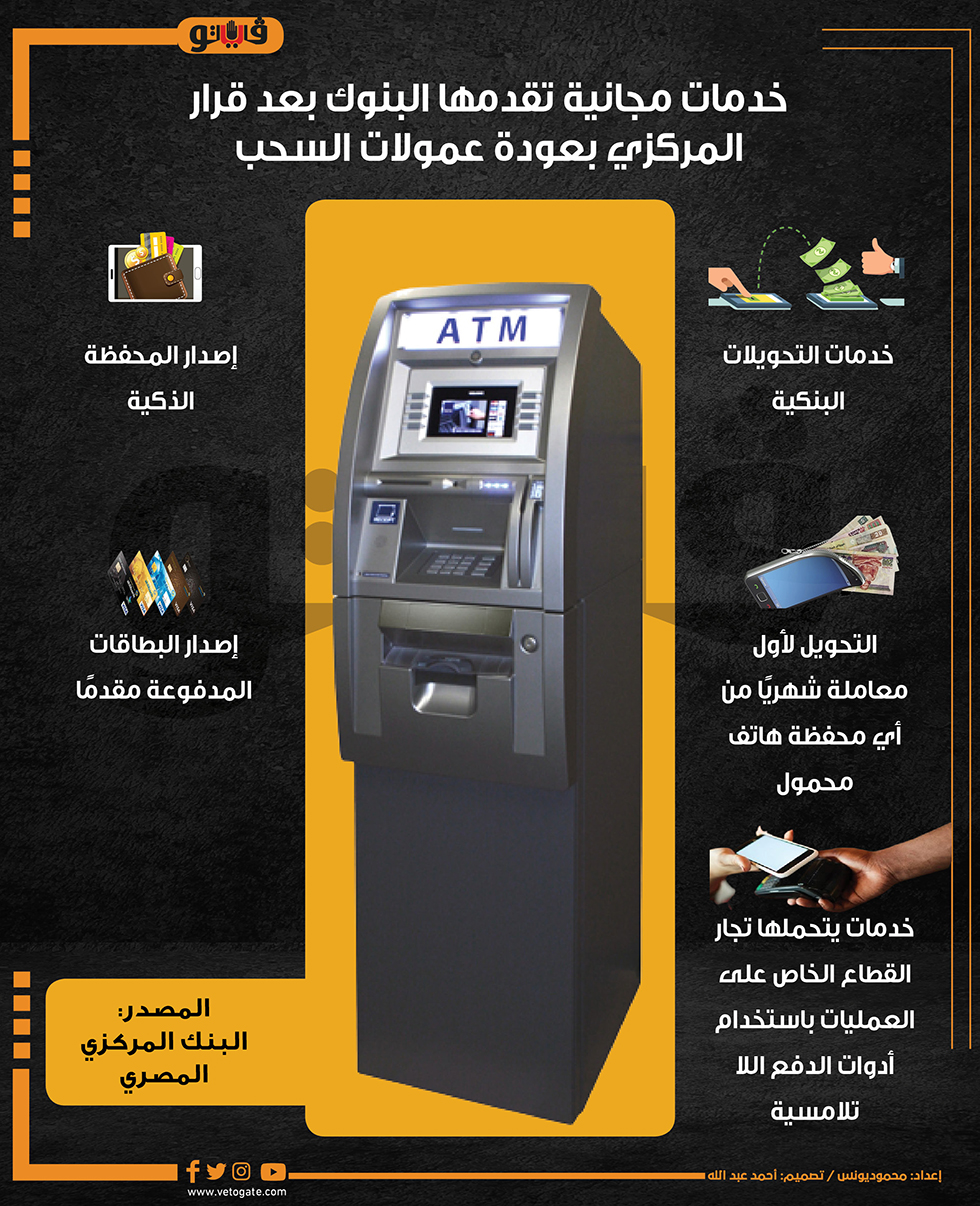 خدمات مجانية تقدمها البنوك بعد قرار المركزي بعودة عمولات السحب| انفوجراف الإثنين 04/يوليو/2022 - 02:00 م 7/4/2022 2:00:04 PM البنك المركزي المصري حاتم أحمد شارك طباعة 18 حجم الخط شارك طباعة البنك المركزى خدمات التحويلات البنكية إصدار المحفظة الذكية إصدار البطاقات المدفوعة مقدم ا أدوات الدفع اللاتلامسية