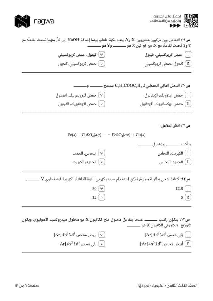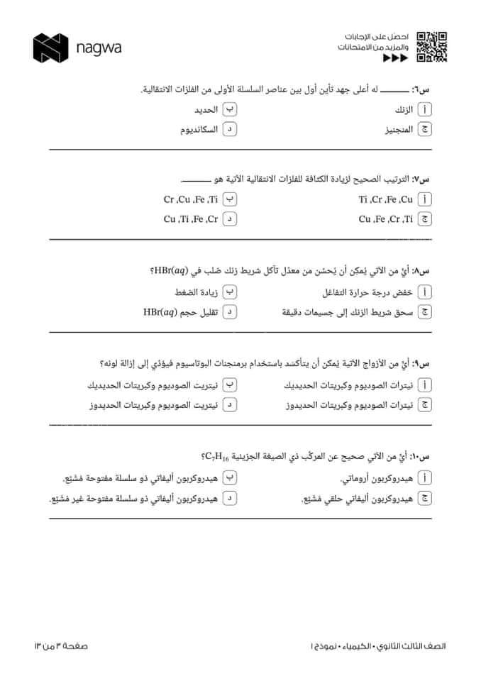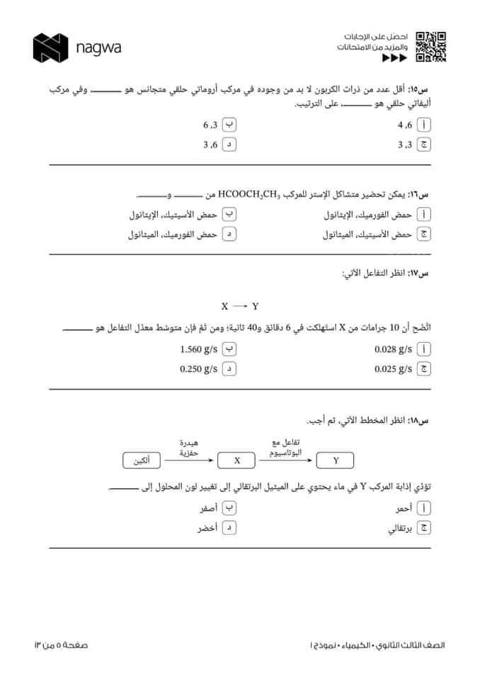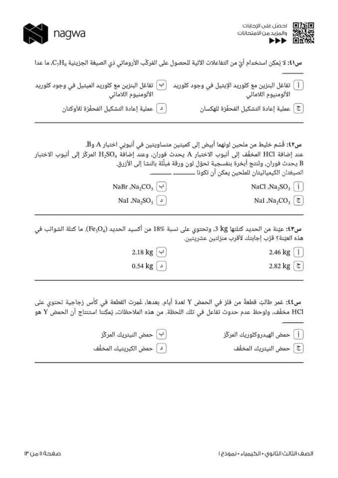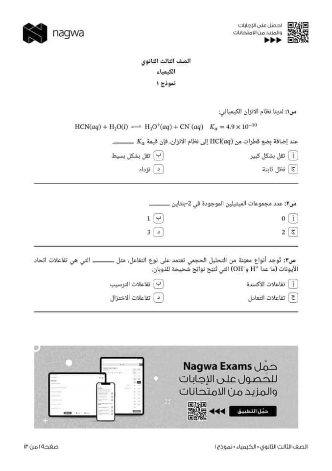 ونشرت منصة نجوى التابعة لوزارة التربية والتعليم نموذج ليلة الامتحان في مادة الكيمياء لطلاب الصف الثالث الثانوي 2022.