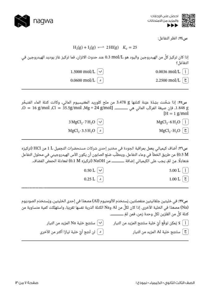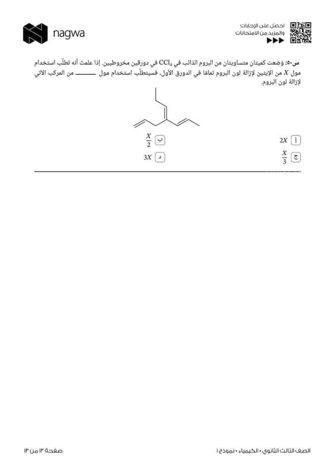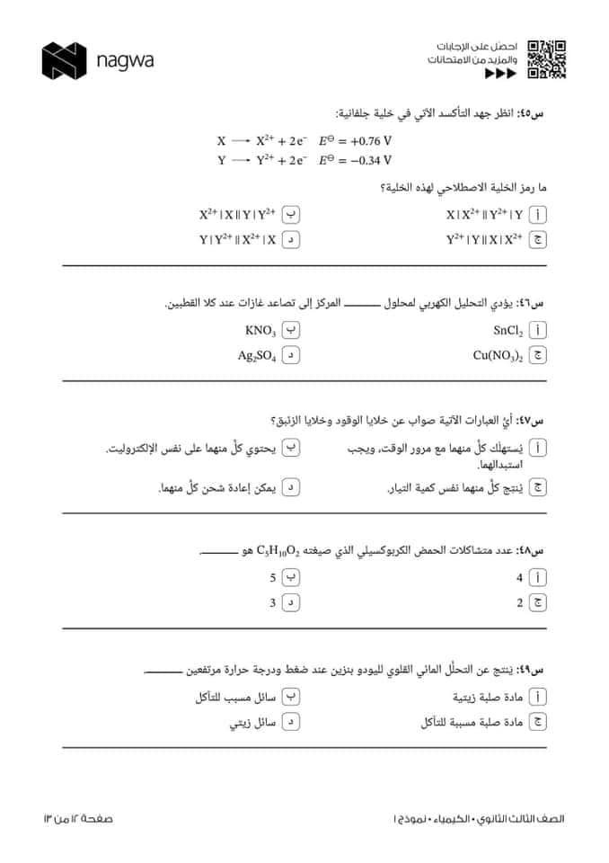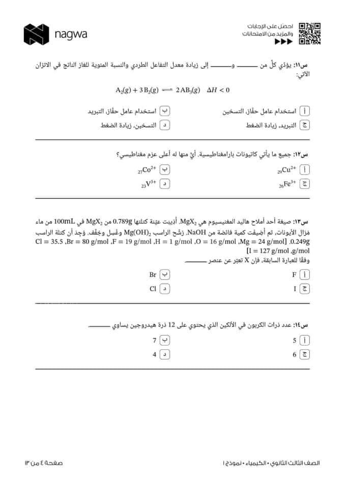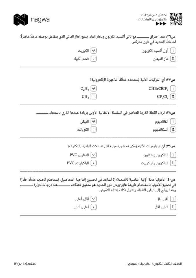 ونشرت منصة نجوى التابعة لوزارة التربية والتعليم نموذج ليلة الامتحان في مادة الكيمياء لطلاب الصف الثالث الثانوي 2022.