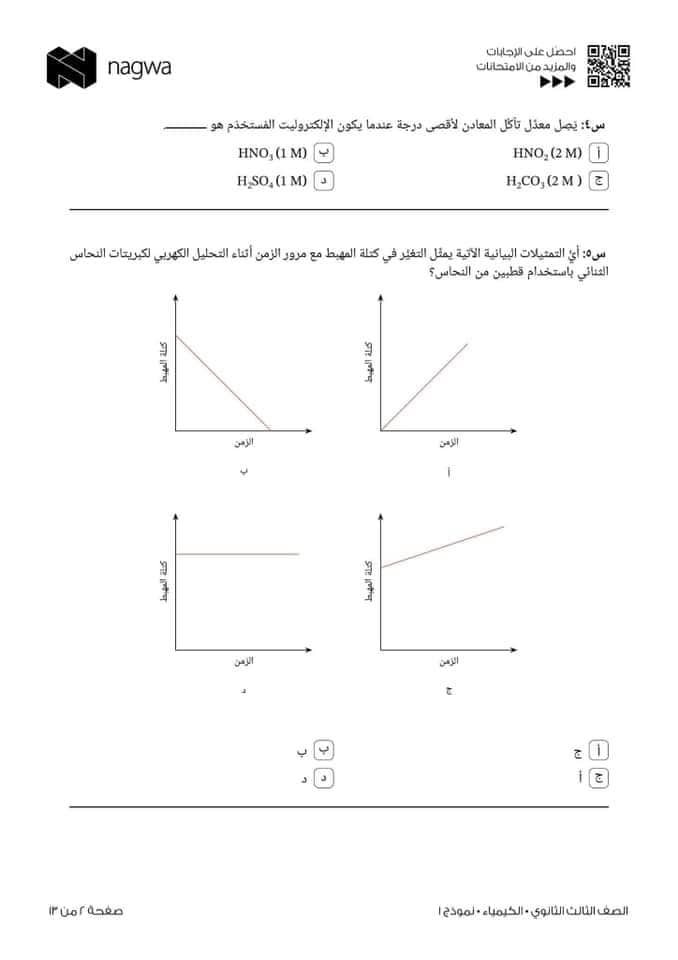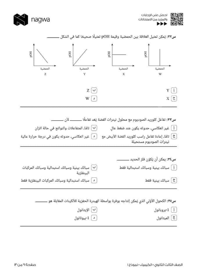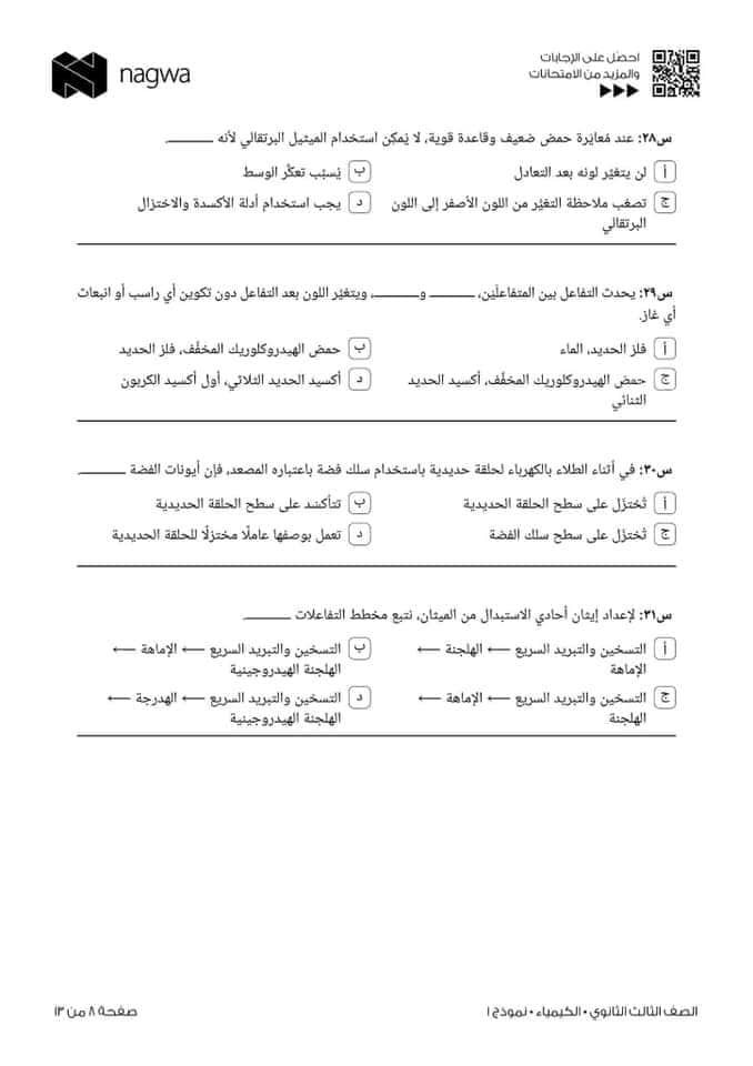 امتحان الكيمياء زمن الإجابة من 9 - 12 للشعبة العلمية.
