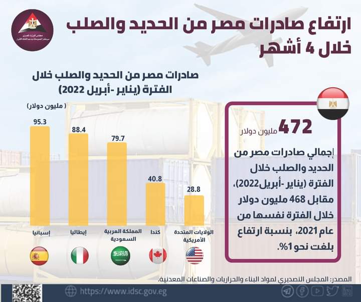 ووفقًا للتقرير الشهري الصادر عن المجلس التصديري لمواد البناء والحراريات والصناعات المعدنية، ارتفعت صادرات مصر من الحديد والصلب خلال الفترة (يناير -أبريل 2022) بنحو 1% لتسجل نحو 472 مليون دولار مقابل 468 مليون دولار خلال الفترة نفسها من عام 2021.