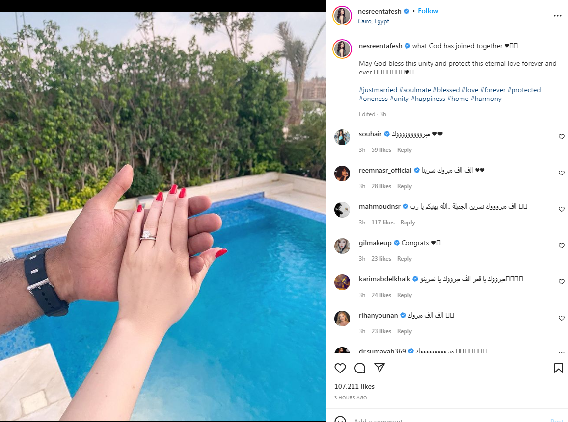 وانهالت التهاني والمباركات من متابعي نسرين من خلال التعليقات، إلا أنها لم تكشف عن شخصية العريس واكتفت فقط بالإعلان عن الارتباط.