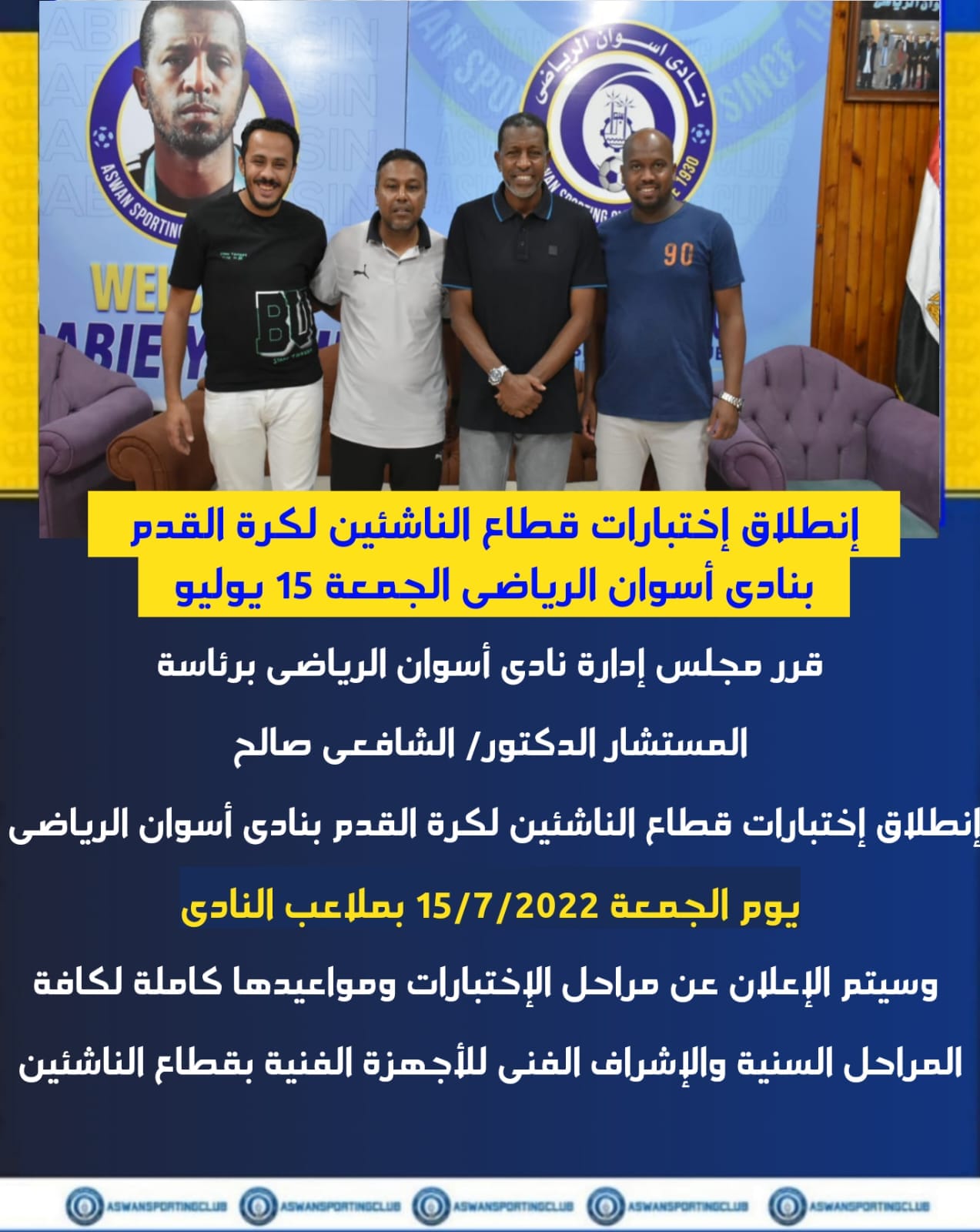 وأكد نادي أسوان أنه سيتم الإعلان عن تفاصيل الاختبارات والمراحل السنية المطلوبة خلال الفترة المقبلة.