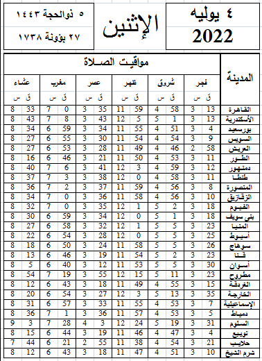 مواقيت الصلاة اليوم وفقًا للتوقيت المحلي لمدينتي القاهرة والإسكندرية وعدد من مدن ومحافظات الجمهورية: