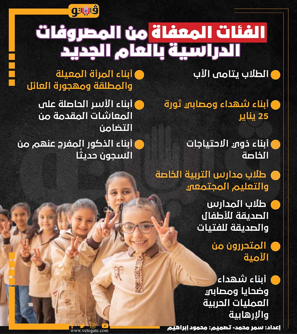 وجاءت الفئات المعفاة من المصروفات الدراسية بالعام الجديد كالتالي: