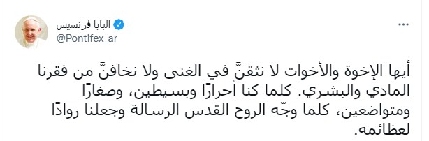 وكتب البابا فرنسيس تغريدة على تويتر "أيها الإخوة والأخوات لا نثقنَّ في الغنى ولا نخافنَّ من فقرنا المادي والبشري. كلما كنا أحرارًا وبسيطين، وصغارًا ومتواضعين، كلما وجّه الروح القدس الرسالة وجعلنا روادًا لعظائمه."