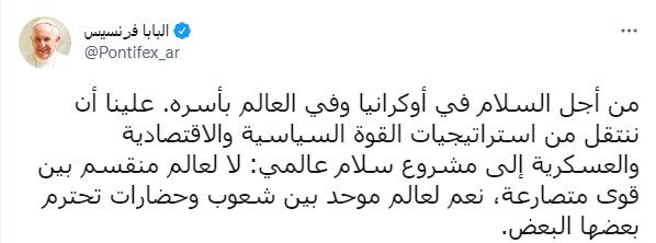 وقال "من أجل السلام في أوكرانيا وفي العالم بأسره. علينا أن ننتقل من استراتيجيات القوة السياسية والاقتصادية والعسكرية إلى مشروع سلام عالمي: لا لعالم منقسم بين قوى متصارعة، نعم لعالم موحد بين شعوب وحضارات تحترم بعضها البعض."