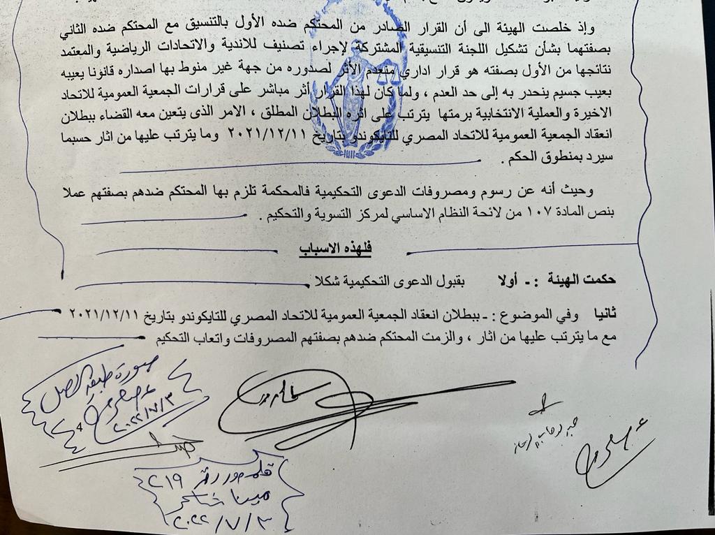 أصدر مركز التسوية والتحكيم الرياضي قرارا ببطلان انتخابات اتحاد التايكوندو والتي أسفرت عن فوز المستشار محمد مصطفى بمقعد الرئاسة.