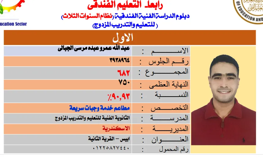 وتابع أن نجله حرص على دخول التعليم الفندقي نظرا لحبه الشديد لهذا المجال، رغم أن والده يعمل في مجال النجارة وكان من الاولى التحاق نجله بهذا القسم في التعليم الفني، موضحا في الأخير احترم رغبة ابنه في الالتحاق بما يحب، حتى حصل على المركز الأول في التخصص الذي اختاره.
