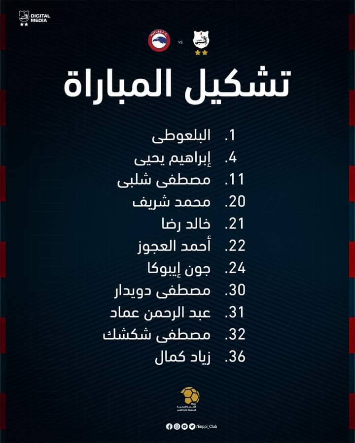 وجاء تشكيل إنبي كالتالي: عبد العزيز البلعوطي، وإبراهيم يحيى ومحمد شريف وخالد رضا، وأحمد العجوز مصطفى دويدار، ومصطفى شكشك وعبد الرحمن عماد وزياد كمال، مصطفى شلبي، جون إيبوكا.