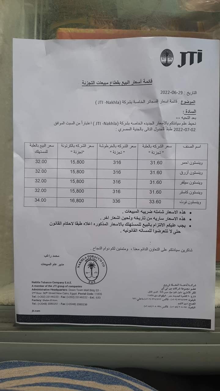أعلنت الشركة اليابانية الدولية للتبغ “جابان توباكو انترناشونال”، قائمة أسعار بيع صنف السجائر" وينستون “ والتي بدأت اعتبارا من 2-7، حيث تم رفع قيمة السعر بمقدار جنيه، وتنتج الشركة أصناف ”وينستون -كامل -LD"