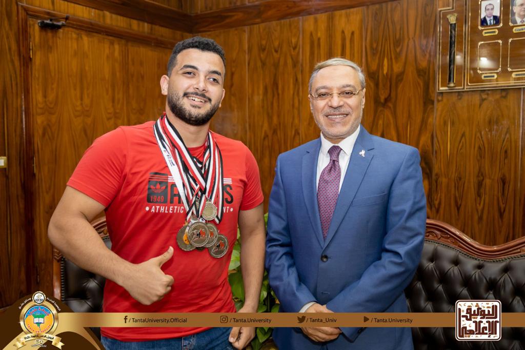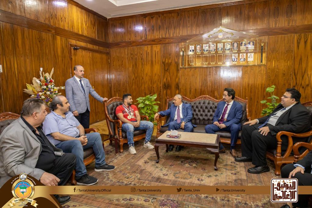 استقبل الدكتور محمود زكي رئيس جامعة طنطا بمكتبه البطل العالمي محمد الجمال الطالب بالفرقة الرابعة بكلية الآداب بالجامعة.