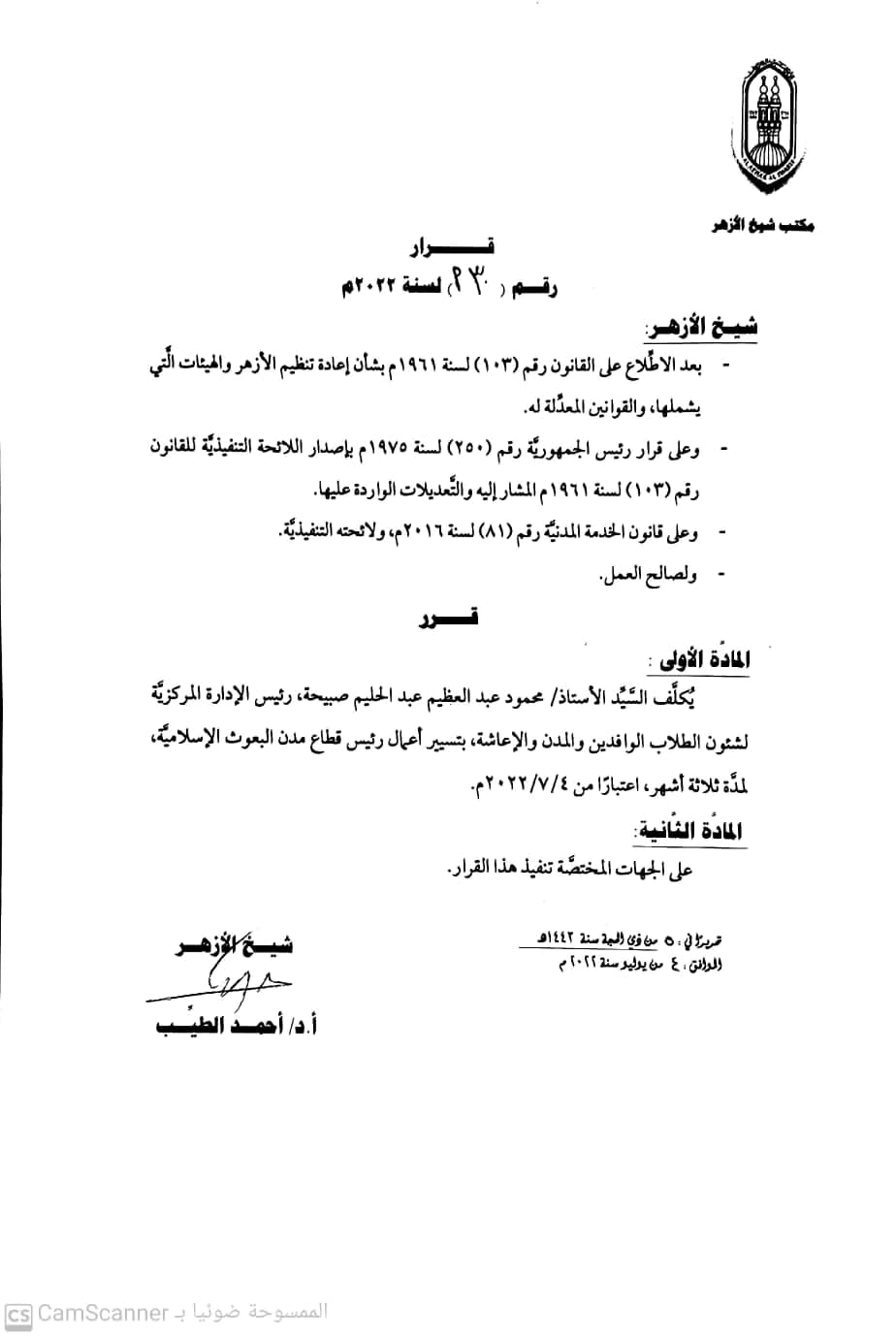 أصدر فضيلة الإمام الأكبر الدكتور أحمد الطيب، شيخ الأزهر الشريف، قرار رقم 30 أ لعام 2022، بتكليف العميد محمود عبد العظيم صبيحة، رئيس الإدارة المركزية لشؤون الطلاب الوافدين والمدن والإعاشة، بتسيير أعمال رئيس قطاع مدن البعوث الإسلامية.