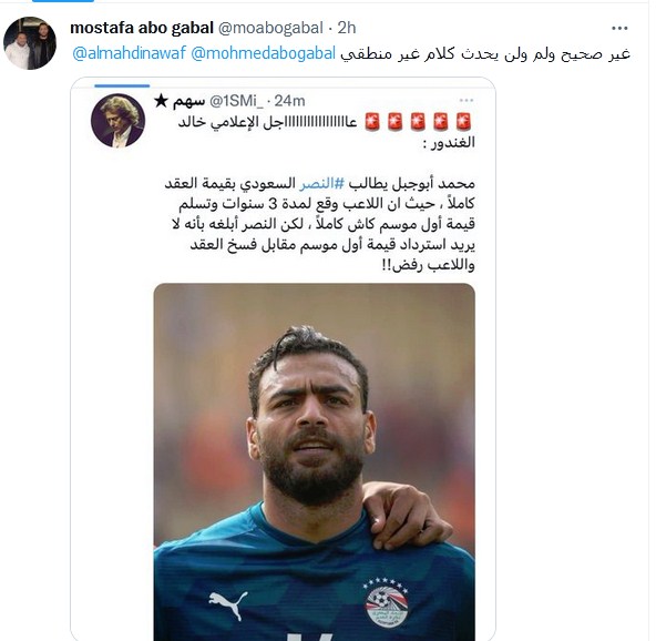 وأعاد مصطفى أبوجبل تغريدة عبر ”تويتر“ كُتب فيها: ”عاجل، الإعلامي خالد الغندور.. ”محمد أبوجبل يطالب النصر السعودي بقيمة العقد كاملًا، حيث إن اللاعب وقَّع لمدة 3 سنوات وتسلم قيمة أول موسم كاش كاملًا، لكن النصر أبلغه بأنه لا يريد استرداد قيمة أول موسم مقابل فسخ العقد واللاعب رفض“.