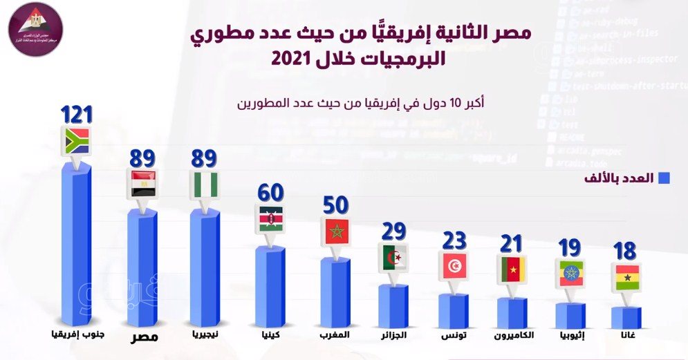 وجاءت مصر في المرتبة الثانية على مستوى القارة الأفريقية من حيث عدد مطوري البرمجيات خلال 2021 بنحو 89 ألف مطور، بينما جاءت جنوب أفريقيا في المرتبة الأولى من حيث عدد المطورين بنحو 121 ألف مطور.