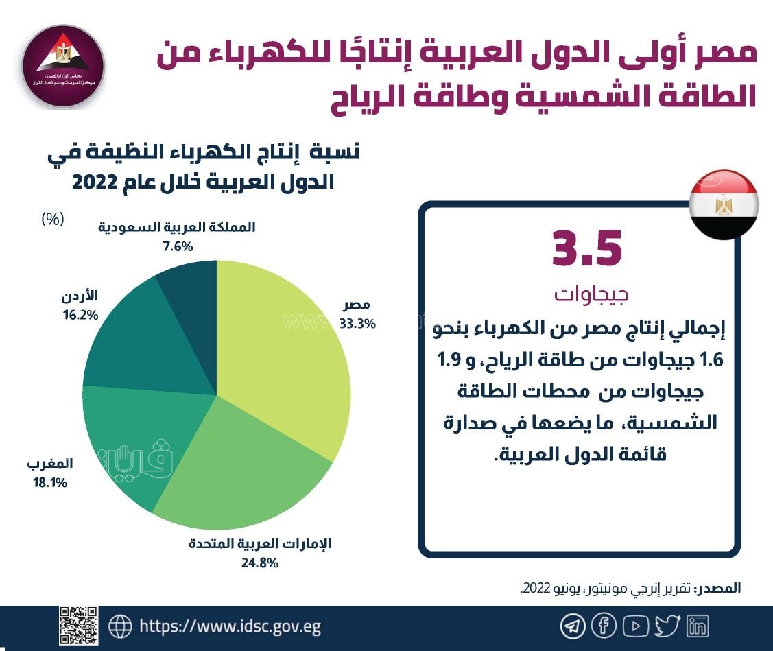 نشر مركز المعلومات ودعم اتخاذ القرار بمجلس الوزراء انفوجراف جديد عبر صفحته الرسمية على موقع التواصل الاجتماعي فيسبوك تحت عنوان "مصر الأولى عربيا في إنتاج الكهرباء من الطاقة الشمسية وطاقة الرياح".