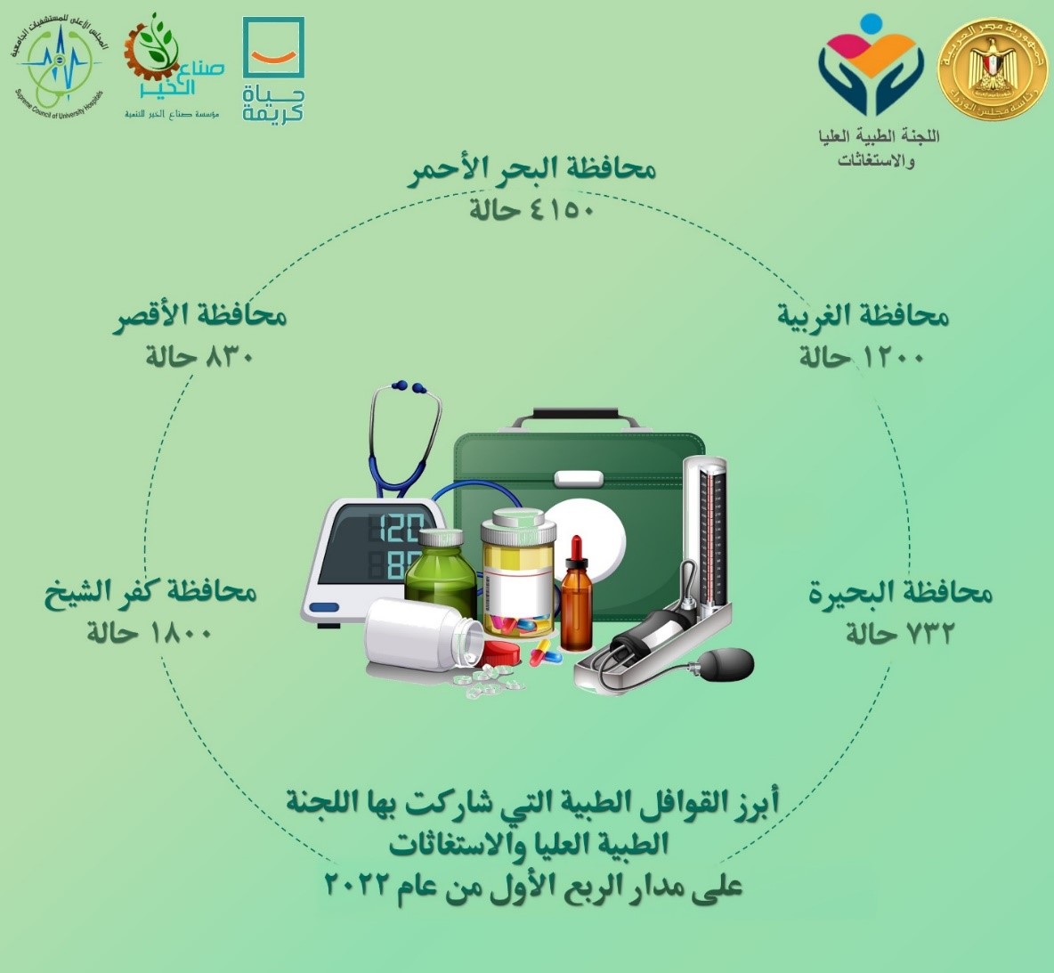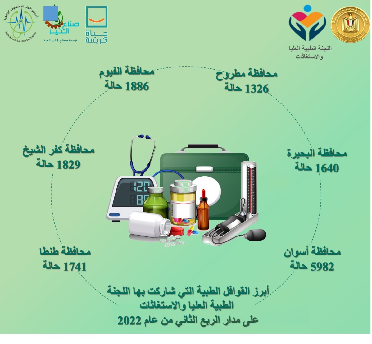ونوه المستشار الطبي لرئاسة مجلس الوزراء خلال التقرير إلى أن اللجنة الطبية العليا والاستغاثات شاركت فى العديد من القوافل الطبية التى تم تنفيذها بالتعاون مع كل من مؤسسة حياة كريمة، ومؤسسة صناع الخير للتنمية، والمجلس الأعلى للمستشفيات الجامعية، بالعديد من المحافظات خلال النصف الأول من عام 2022.