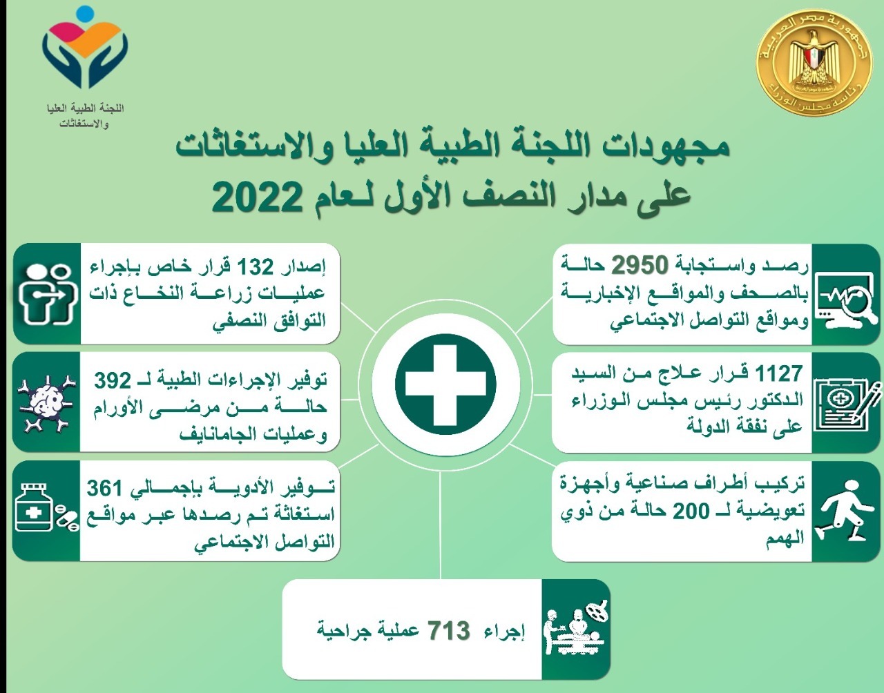 وأشار المستشار الطبي لرئاسة مجلس الوزراء إلى أن الاستجابات خلال النصف الأول من عام 2022 شملت صدور 1127 قرار علاج من رئيس الوزراء على نفقة الدولة، للفئات الأكثر احتياجًا، فضلًا عن إجراء 713 عملية جراحية، وإصدار 132 قرارا خاصا بإجراء عمليات زراعة النخاع ذات التوافق النصفي.