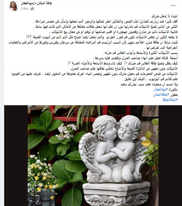 وكتبت مها العطار تدوينة على الفيس بوك "اشياء لا تدخل منزلك.. اقف كثيرا عند زيارتي للمنازل امام الصور والتماثيل انظر لشكلها والرموز التي تحملها واسأل عن مصدر شراءها."