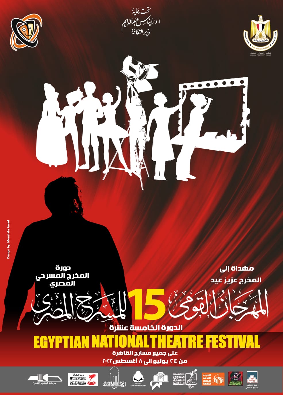وكان المهرجان القومي للمسرح كشف عن تفاصيل أفيش دورته الخامسة عشرة، والذي صممه الفنان مصطفى عوض وقال عنه: "الأفيش هذا العام له طابع خاص ويدور حول أهمية عمل المخرج المسرحى، حيث يظهر على الأفيش الرسمى للمهرجان المخرج المسرحى، وهو ينظر لفريق العمل المسرحى وهم يستعدون للصعود على المسرح، منهم البنت الأولى التى تضع الميك آب، وبجانبها ممثلة ثم راقصة البالية وبعض الممثلين ومسئول الإضاءة".