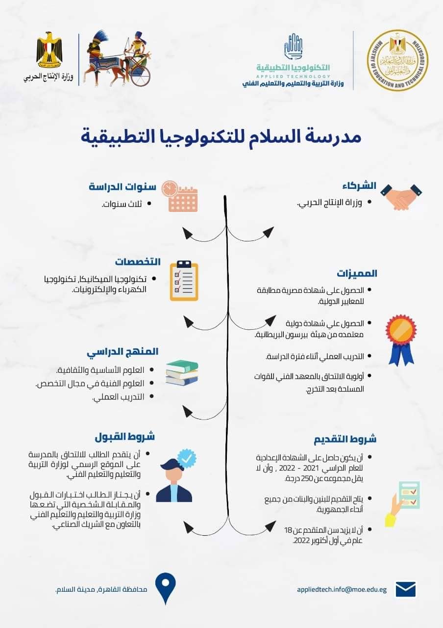 وأعلنت وزارة الإنتاج الحربي شروط التقديم والقبول الخاصة بمدرسة السلام للتكنولوجيا التطبيقية: