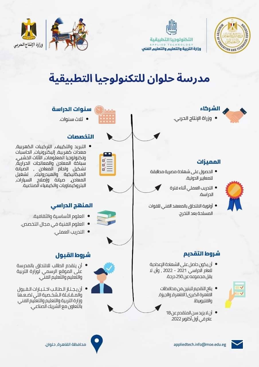أعلنت وزارة الإنتاج الحربي فتح باب التقدم للالتحاق بمدرستيْ الإنتاج الحربي للتكنولوجيا التطبيقية بالسلام وحلوان، وذلك للطلاب الحاصلين على الشهادة الإعدادية للعام الدراسي (2022/2023)، لمدة 15 يومًا حتى 20 يوليو 2022، على الرابط التالي: