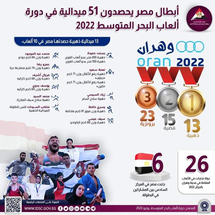نشر مركز المعلومات ودعم اتخاذ القرار بمجلس الوزراء إنفوجرافًا جديدًا عبر صفحته الرسمية على موقع التواصل الاجتماعي فيسبوك تحت عنوان "أبطال مصر يحصدون 51 ميدالية في دورة ألعاب البحر المتوسط 2022".
