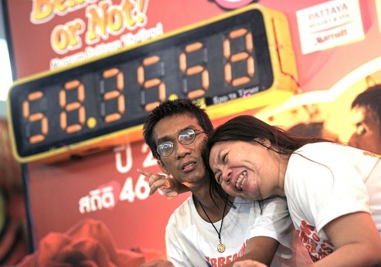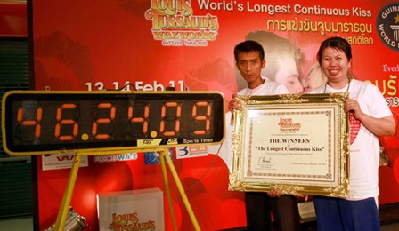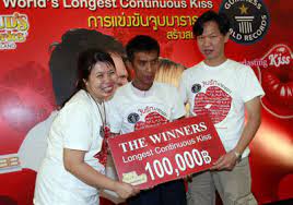 وحقق الزوجان إيكاتشاى ولاكسانا تيرانارات من بانكوك في تايلاند رقما قياسيا في أطول قبلة، بعدما استمرا 58 ساعة و35 دقيقة في قبلة واحدة؛ واعتبرت تلك القبلة الأطول في التاريخ.