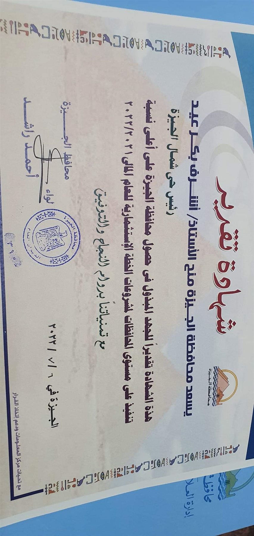 وأكد اللواء أحمد راشد محافظ الجيزة في وقت سابق أن المحافظة تمكَّنت من إنجاز الخطة الاستثمارية للعام المالي ٢٠٢١ / ٢٠٢٢ بنسبة ١٠٠% الأمر الذي حصلت به المحافظة على المركز الأول بين المحافظات.