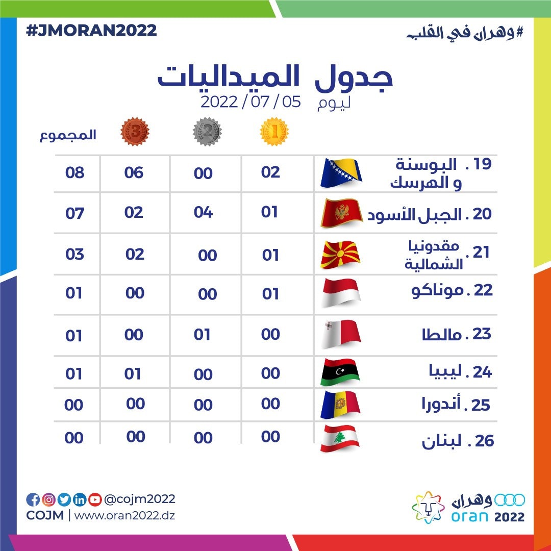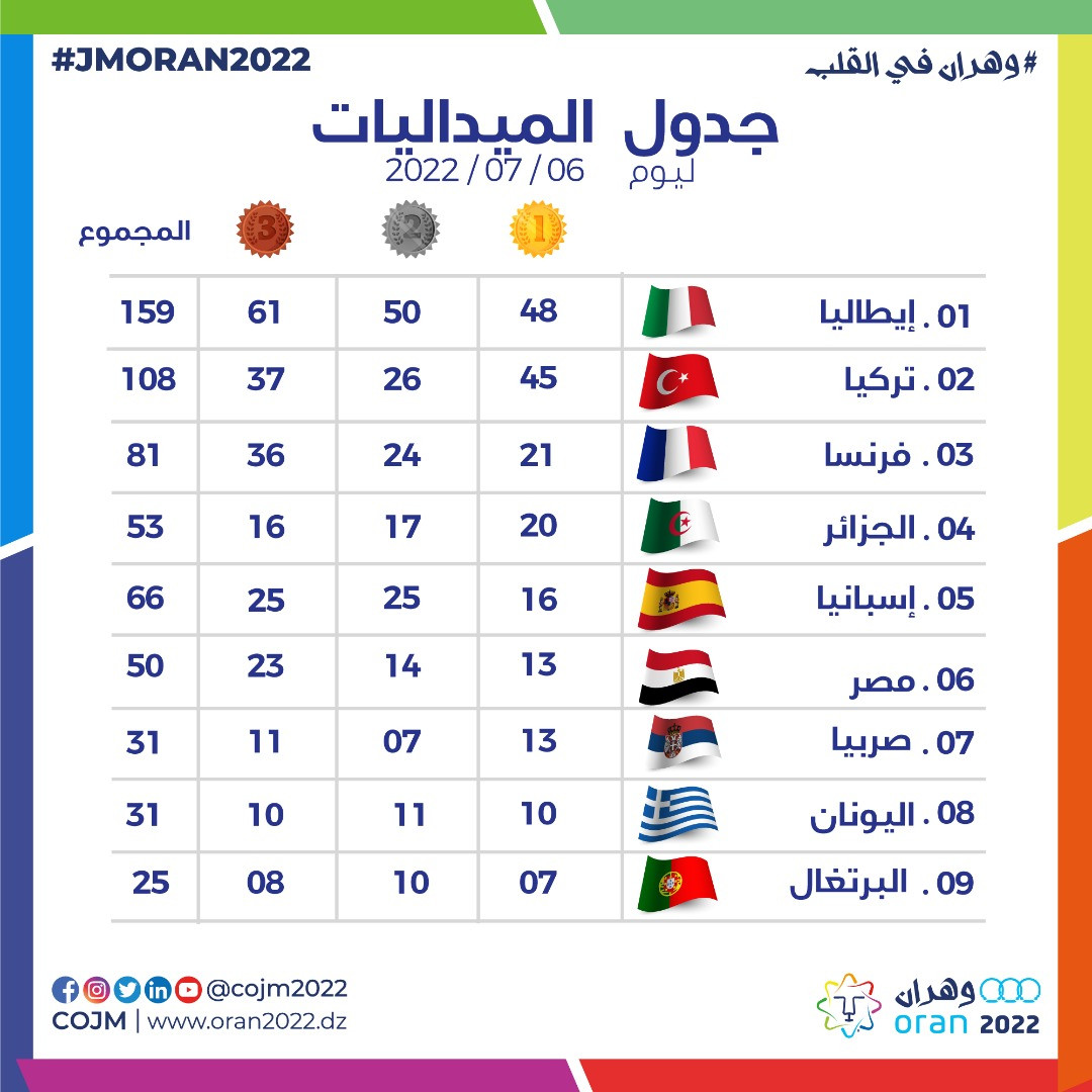 وجاءت الجزائر في المركز الرابع بـ53 ميدالية منها 20 ذهبية، ثم تأتي إسبانيا في المركز الخامس برصيد 66 ميدالية منها 16 ذهبية.
